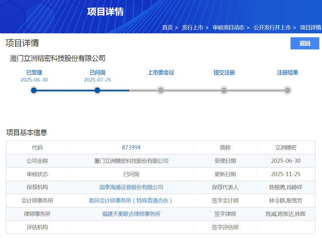 北交所网站显示,11月25日,北交所网站更新了对厦门立洲精密科技股份有限公司(以下简称“立洲精密”)公开发行股票并在北交所上市申请文件的第二轮审核问询函,问询焦点直指同业竞争、毛利率异常、募投项目必要性等问题。