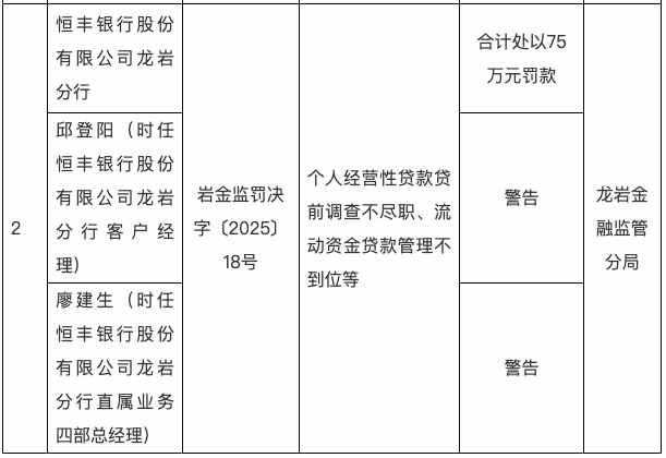 11月25日,福建监管局旗下龙岩金融监管分局发布行政处罚信息公示表显示,恒丰银行股份有限公司龙岩分行因存在“个人经营性贷款贷前调查不尽职、流动资金贷款管理不到位”等违法违规行为,被合计处以罚款75万元;时任龙岩分行客户经理邱登阳、 时任龙岩分行直属业务四部总经理廖建生均被给予警告。