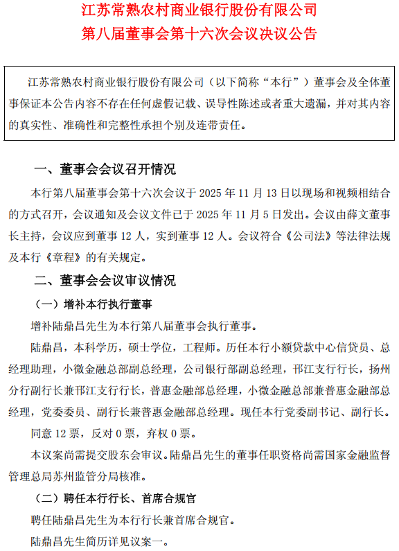 同日,常熟银行发布了董事会决议公告,聘任陆鼎昌为该行行长兼首席合规官,并增补陆鼎昌为该行第八届董事会执行董事。
