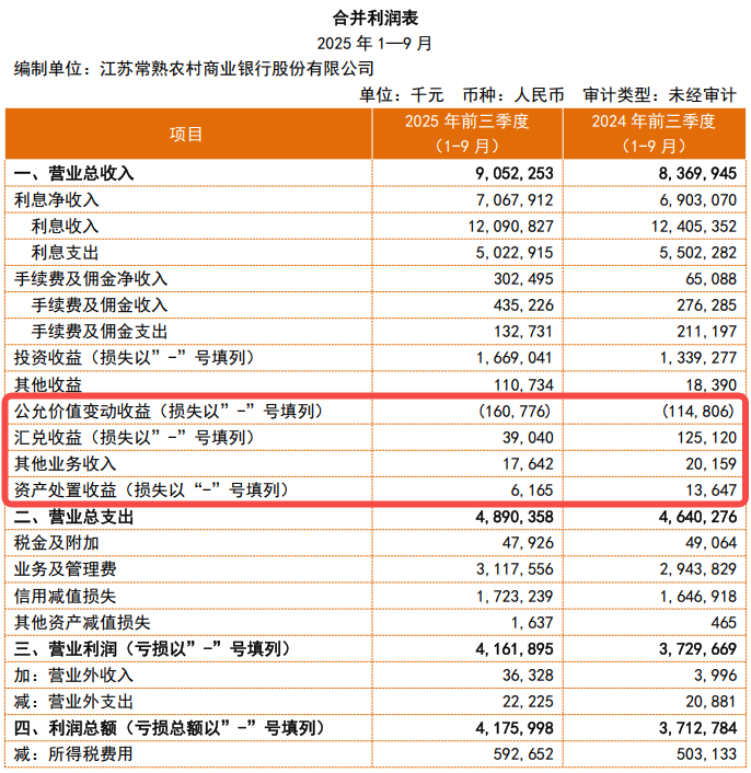 图 / 常熟银行三季度营业收入构成指标(来源:常熟银行2025年三季报)