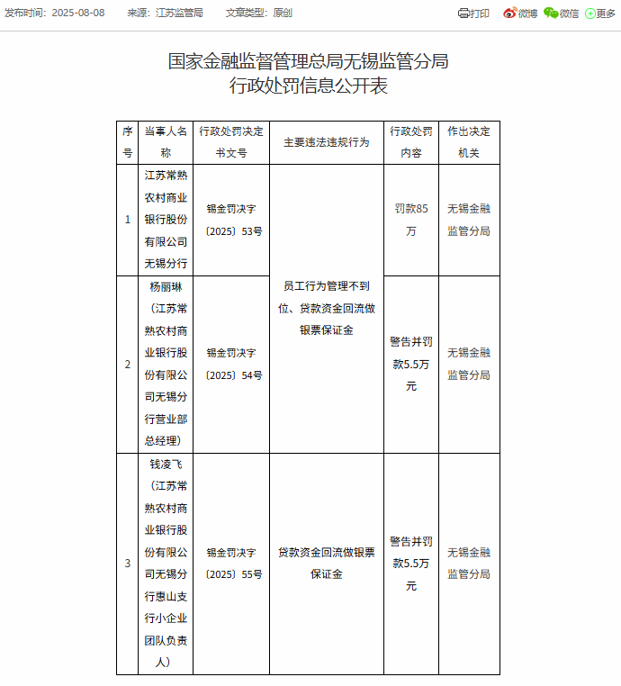 今年8月,监管部门对常熟银行开出了一张85万元的罚单。同时,时任营业部总经理杨丽琳、惠山支行小企业团队负责人钱凌飞均被警告并各罚5.5万元。