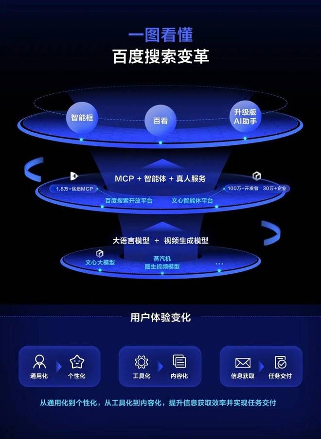 如今百度搜索已形成三层AI技术生态体系。 以自研文心大模型、蒸汽机图生视频模型为支撑的模型层,由智能体和MCP等构成的平台工具层,以及由智能框、百看和AI助手等构成的应用体验层。