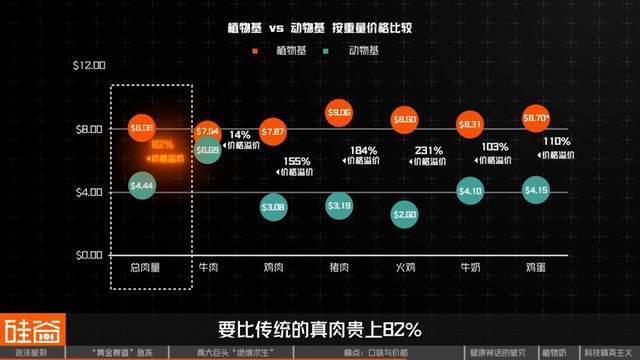 总体来说,植物肉的平均价格,要比传统的真肉贵上82%,几乎要翻一倍。