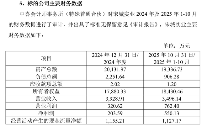 从财务数据看,公告显示,截至2025年10月31日,宋城实业的资产总额为1.93亿元。2024年、2025年1-10月,宋城实业的营业收入分别为3928.91万元、3496.14万元,营业利润分别为320.62万元、762.40万元。