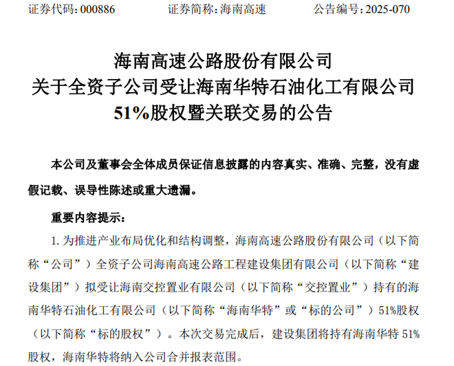 海南高速表示,交易完成后,建设集团将持有海南华特51%股权,海南华特将纳入公司合并报表范围。海南华特主营沥青仓储加工业务,建设集团收购后,海南华特可提供稳定的交通材料供应链支持。