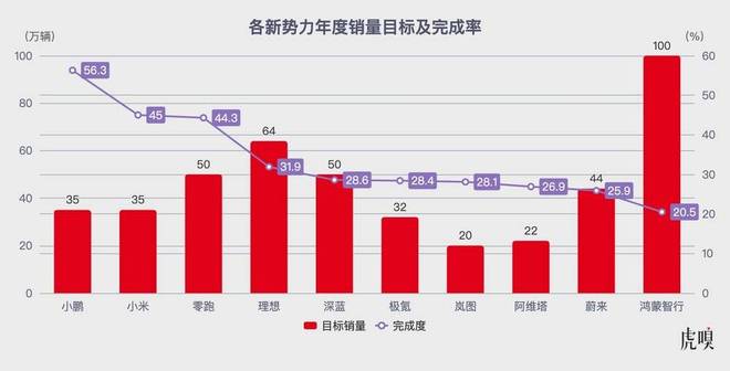 它们不仅是新势力中上半年的销量前五,同时也是销量前五中增速最快的车企;并且,这三家还是所有新势力中,年度销量目标完成率最高的存在 (因为年度销量目标还能一定程度上反映车企的生产销售的极限能力,完成比率更能代表车企的实际经营效率)。