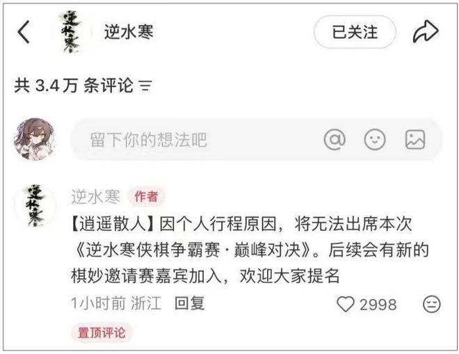第一波冲击,涌向了网易。因为曾邀请逍遥散人参与赛事活动,网易《逆水寒》手游官方账号成沦陷区,《逆水寒》官方最终不得不宣布,"逍遥散人"因"个人行程原因"缺席活动。
