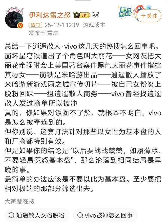 七届B站百大up主、知名游戏解说博主"逍遥散人"在直播试玩米哈游另一款游戏《Varsapura》时,拒绝了部分粉丝"因A游戏争议抵制B游戏直播"的要求,称"现在什么游戏都有争议"。