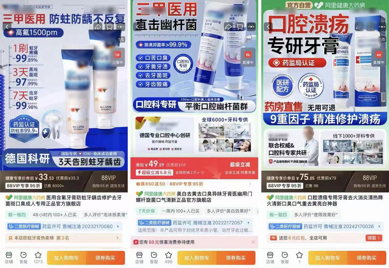 《FBeauty未来迹》在电商平台发现,有多款“牙膏”产品实为械字号,并打上“三甲医用”标签,宣称“防蛀”“幽门螺旋杆菌”“口腔溃疡专研”。这种“字号”混淆,实质上模糊了妆、药、械的边界,让消费者在购买牙膏时难以判断功效需求。