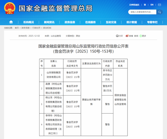 12月4日,国家金融监督管理总局山东监管局发布了一张罚单,剑指山东钢铁集团财务有限公司及其相关责任人。