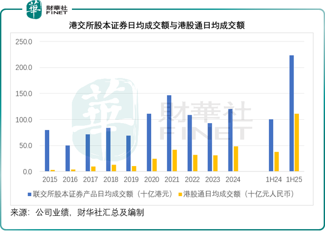 从上图可以看到,现货交易是港交所主营收入强劲增长的头号功臣,这主要得益于港股交易畅旺。按港交所提供的数据,2025年上半年,股本证券产品日均成交额按年大增1.22倍,至2,228亿港元,这其中南下资金的贡献不容忽视,港股通日均成交额按年大增1.96倍,达到1,110亿港元。股票交易畅旺也带动了权证和ETF等产品的交易急增,期内衍生权证、牛熊证及权证日均成交额也按年增长72%。