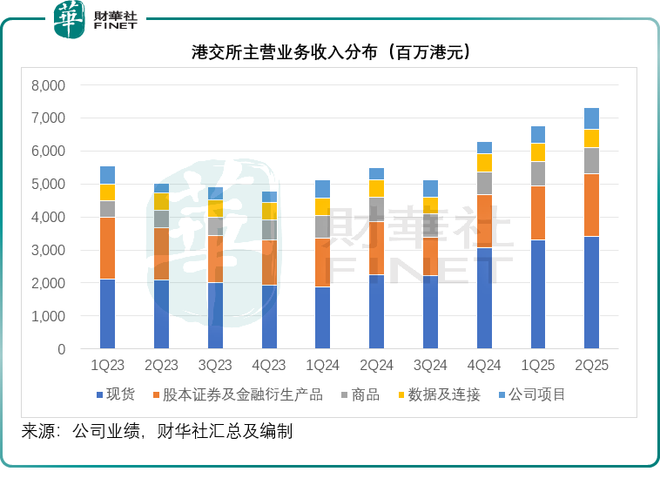 我们留意到,2025年第2季,港交所的主要业务收入增幅有所放缓,按年增长31.91%,低于第1季的增幅35.60%,其中股本证券产品日均成交额从第1季的2,254亿港元,降至2,203亿港元。