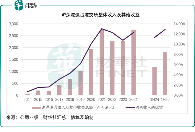 今年上半年,内地与香港的联动进一步密切,南向通和北向通交投均创新高,沪深港通收入及其他收益占比也进一步提升,见下图,2025年上半年,沪深港通收入及其他收益总额按年增长51.21%,至18.13亿港元,增幅远超其整体收入及其他收益总额增幅32.53%,占总收入的比重已从上年同期的11.29%进一步上升至12.88%。
