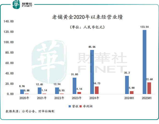 根据业绩报,于今年上半年,老铺黄金实现营业收入123.54亿元(单位人民币,下同),同比大幅增长251%;期内利润为22.68亿元,同比增幅达285.8%。