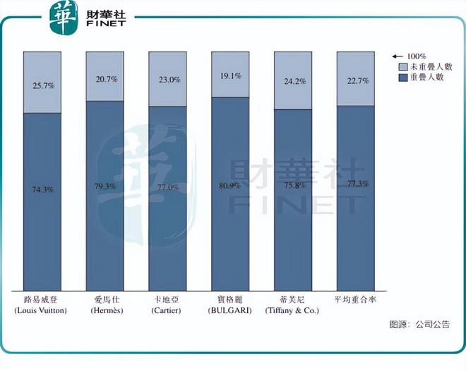 老铺黄金的客户群体与国际奢侈品客户群体高度重合,资料显示,其消费者与路易威登、爱马仕、卡地亚、宝格丽等国际五大奢侈品牌的消费者平均重合率高达77.3%,这表明公司消费者与国际奢侈品牌人群高度契合,具备高端消费特质。