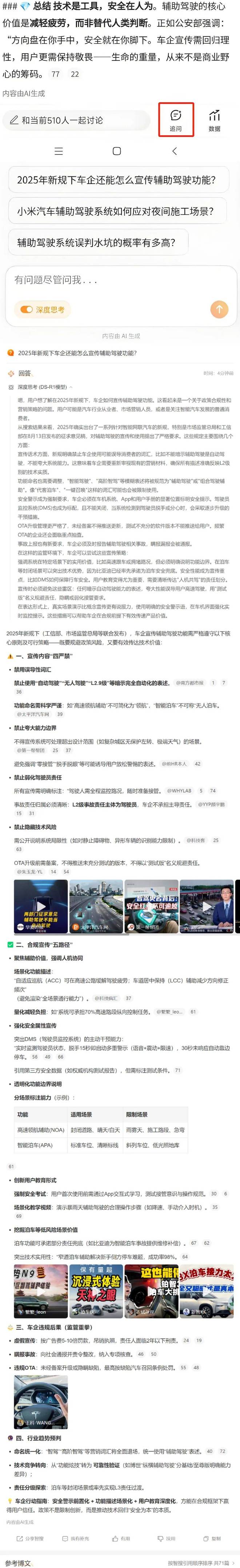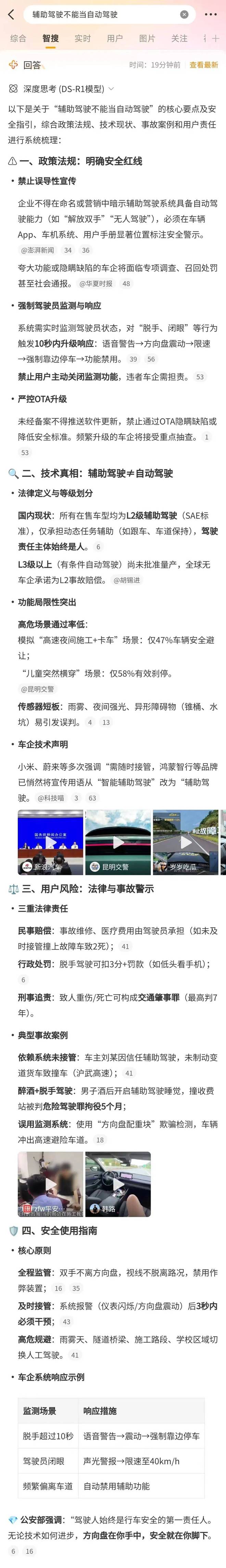 同样搜索"辅助驾驶不能当自动驾驶"话题,微博智搜提供了政策法规、技术现状、用户风险、安全使用指南内容,在介绍相关政策出台动作的同时,也将相关技术领域的大致现状向读者进行了梳理。