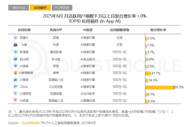 而AI搜索插件的崛起,正在用大模型的"认知能力"重构这一基础场景。对已有极高用户体量的产品来说,平台势能积累已经足够,一旦接入AI插件,立即能调动海量用户需求。
