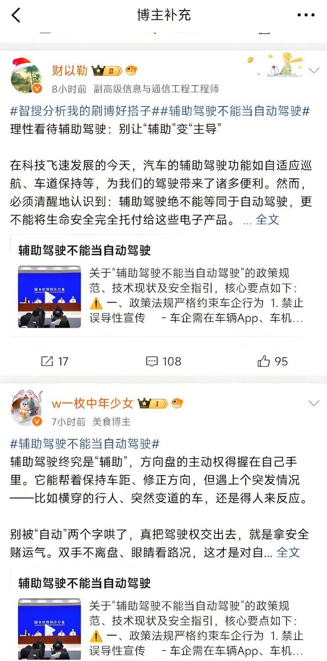 值得注意的,是微博智搜的信源引用数量。除了权威媒体对事件本身的公开报道以外,微博还引用了数十条相关博文用于分析辅助驾驶的技术等细节。这些内容来源包括辅助驾驶领域其他话题的媒体报道、大V博主的相关博文、交通监管部门的提醒公告等。同时在搜索结果末尾,微博智搜附上了博主补充解读。