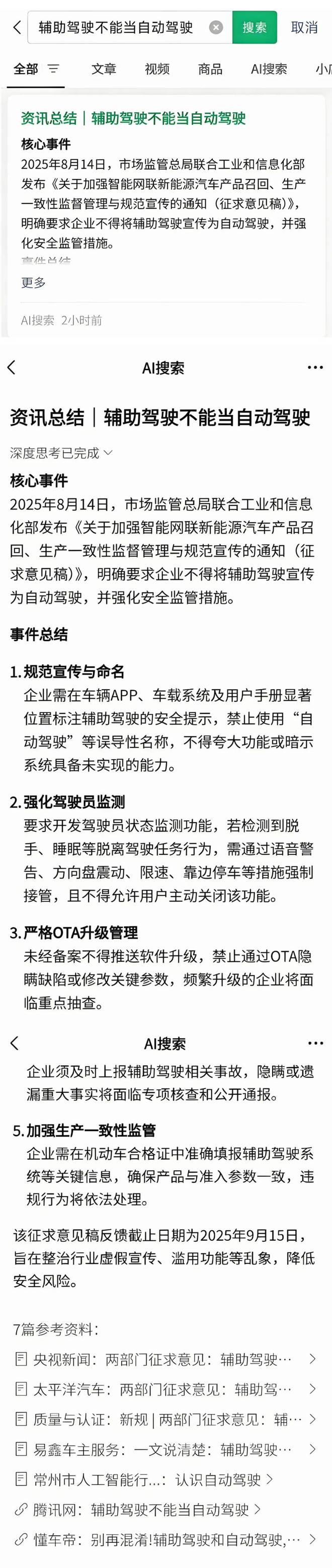 而微信AI搜索的核心优势,明显在于公众号这一独家内容生态。在辅助驾驶热点搜索结果中,微信AI搜索以7篇微信公众号文章为参考文献,实现了对热点信息较为准确的梳理与解析。