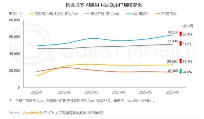 近期QuestMobile发布的《2025年AI应用市场半年报》提供了一种新的可能性。报告披露,截止到2025年6月,移动端原生AI应用用户规模为5.7亿,而更大的市场藏在应用插件里,同期移动端-应用插件(In-App AI)用户规模达到6.3亿,已经超越了原生AI应用。