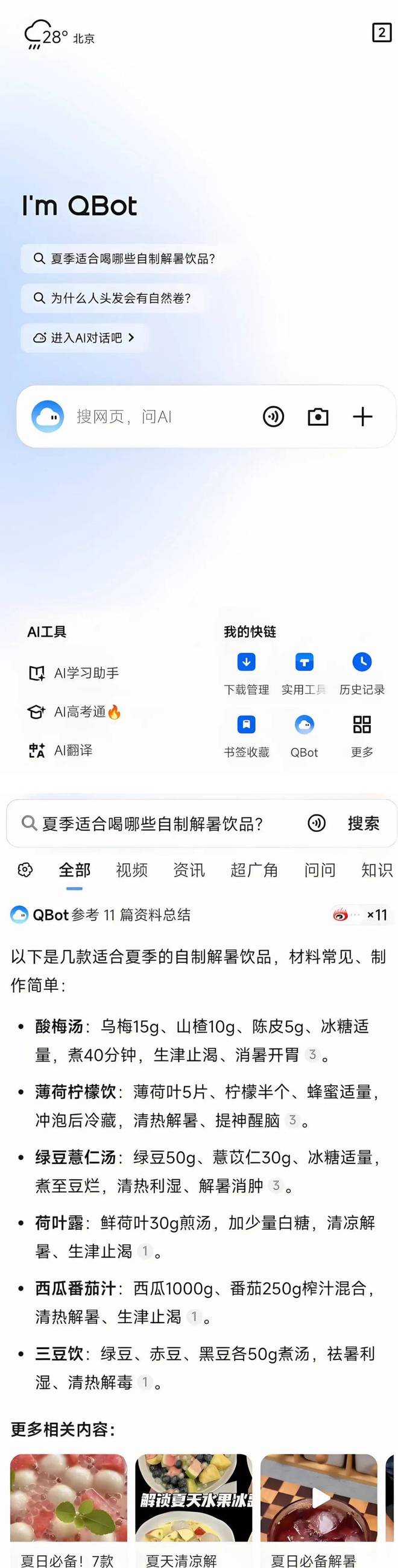 以QQ浏览器为例,今年5月,QQ浏览器宣布升级为AI浏览器,并用AI搜索取代原首页内容。从实际体验看,其Qbot AI侧重生活百科类对话解答,其首页内容即引导用户向AI提问百科类问题,如"夏季自制解暑饮品"等。