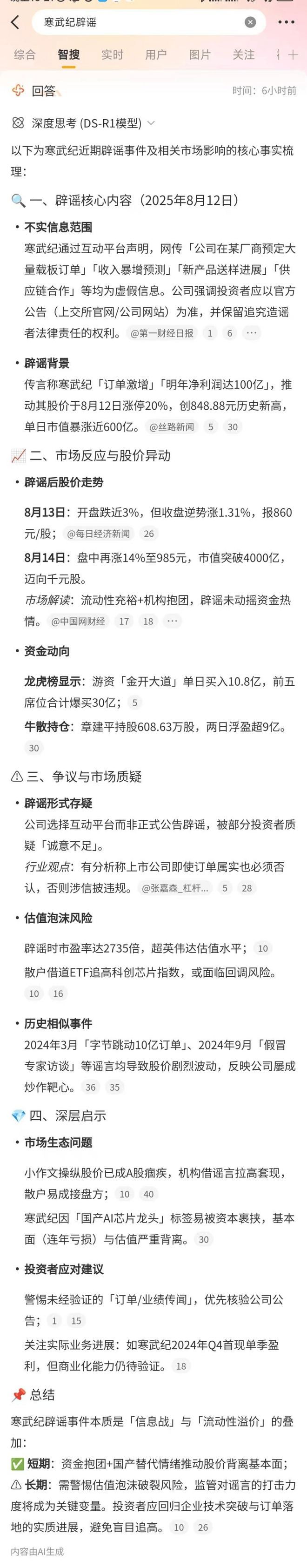 以近期寒武纪辟谣订单谣言为例,相关声明发布后迅速在微博上获媒体转发,相关内容则被迅速收入微博智搜,并形成从官方声明到市场反应、市场质疑、事件解读的完整分析。