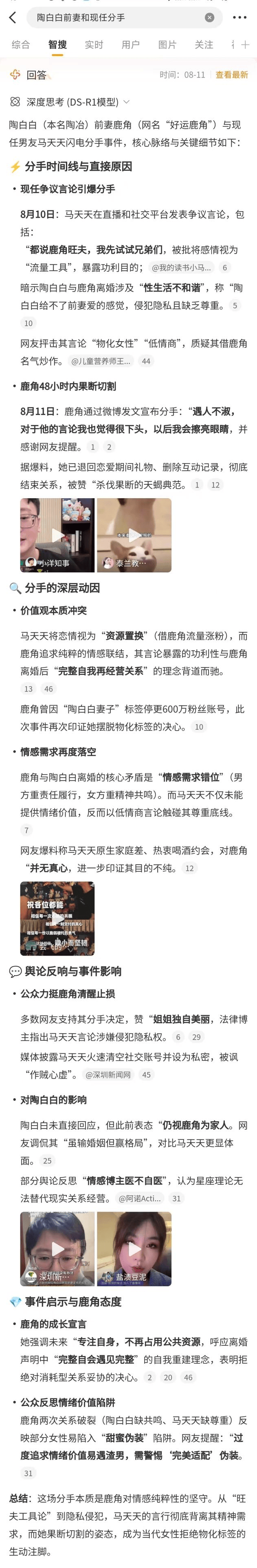 而在热点吃瓜类事件中,微博智搜更能展现出平台热点传播速度快、吃瓜生态健全的优势。以网红博主陶白白的情感纠纷为例,相关事件错综复杂,普通用户很难在短时间内梳理清楚,而微博智搜能在短时间内给出事件每一步的清晰脉络,并将当事人深层动因、网友主流评价、事件的舆论影响完整展现,做到真正意义上的一键吃瓜。
