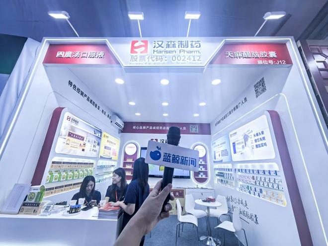 汉森制药精心打造了品牌形象与产品体验深度融合的交流空间。展台不仅集中展示了王牌产品四磨汤口服液,还带来了天麻醒脑胶囊、参七心疏胶囊等产品。