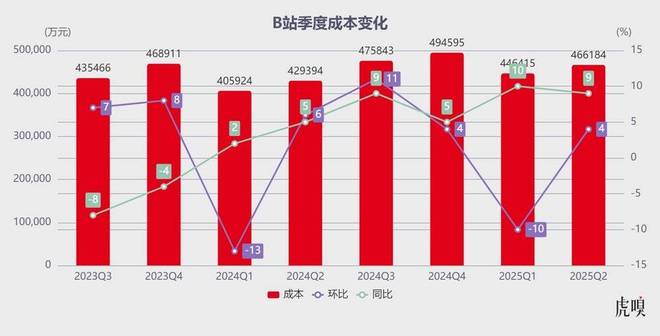 与之对应,2025Q2 季度 B 站成本同比增长 9% 达 46.6 亿元;其中,收入分成成本(营业成本的重要组成部分)同比增长 19% 达29.7 亿元,与 B 站的营业收入增速一致。