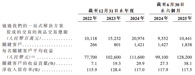 截至2025年6月30日,小鹅通拥有1838名关键客户。2022年~2024年及2025年上半年,小鹅通每名关键客户的平均收入分别为7.77万元、10.26万元、11.16万元及12.82万元;同期,关键客户的收入占比分别为7.1%、19.3%、29.9%以及38.1%。