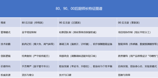 要理解 00 后的颠覆性,需先锚定他们与前辈的本质差异。从各方数据及交流中,大概总结出一张80、90、00后厨师长的特征图谱。