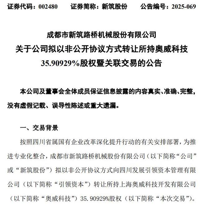 新筑股份(002480)日前公告,8月21日,公司与引领资本签署了《附条件生效的股权转让协议》。公司拟将所持有的奥威科技35.90929%股权转让给引领资本,交易价格为经评估备案的评估值确定为3.61亿元。
