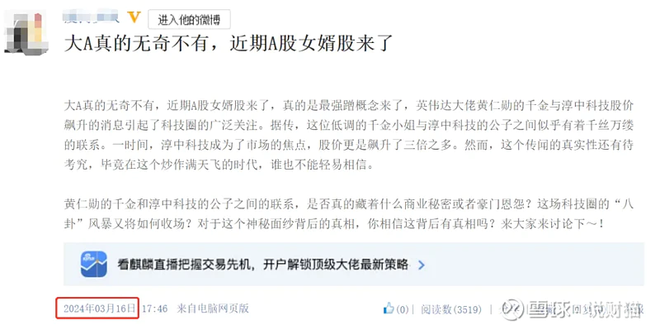 小作文的影响往往极快,几分钟内即可反映在股价上;也可能潜伏一段时间,等待情绪引爆的时机。以淳中科技为例,其传闻早在2024年就已出现“恋爱版”,近期升级为“怀孕版”,配合“黄仁勋家产+中企绑定”的联想空间,迅速完成二次引爆。