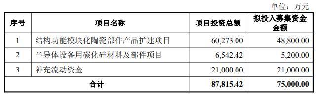 8月25日晚间,珂玛科技(301611)公布公司向不特定对象发行可转债预案,拟募集资金总额不超过7.5亿元,将全部投资于以下项目:结构功能模块化陶瓷部件产品扩建项目、半导体设备用碳化硅材料及部件项目及补充流动资金。