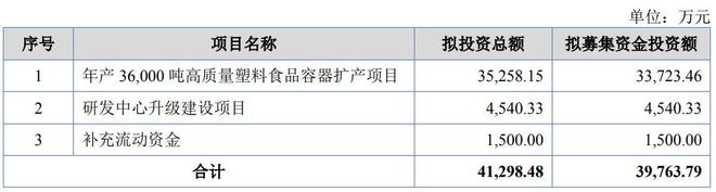 新天力本次发行拟募集资金3.98亿元,拟用于年产3.6万吨高质量塑料食品容器扩产项目3.37亿元(包括设备购置安装费3.19亿元),技术研发中心建设项目4540.33万元(包括设备购置费3232.03万元),补充流动资金1500万元。