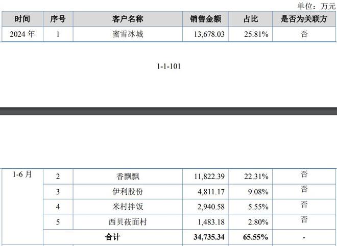 招股书显示,新天力存在客户集中度较高的风险,公司前五大客户的销售占比分别为64.32%、62.10%、63.63%和65.55%。其中,前两大客户香飘飘、蜜雪冰城合计占公司销售收入的比重分别为50.62%、48.79%、50.33%和48.12%。