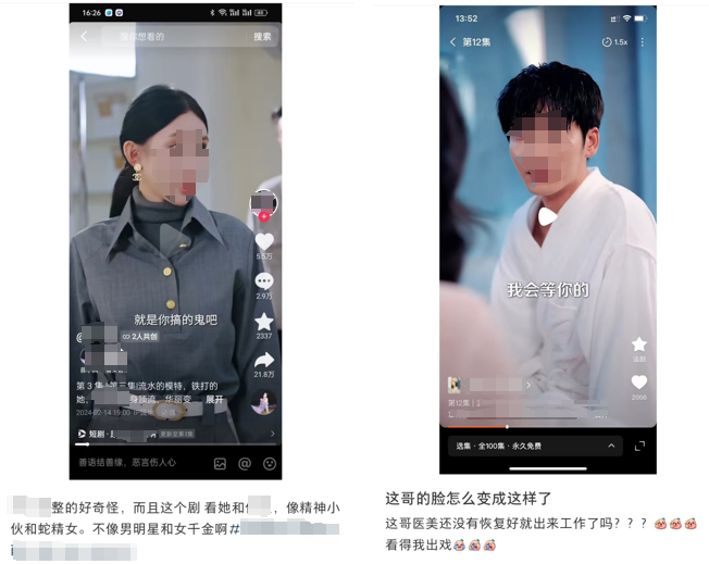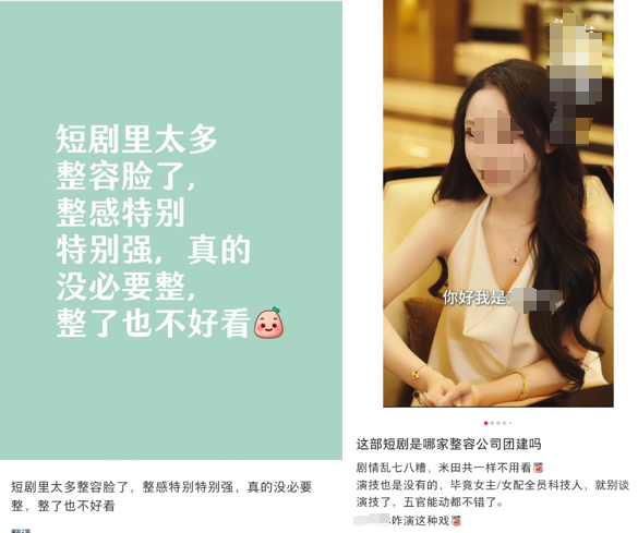 有网友直言:"短剧里太多整容脸了,整感特别特别强,真的没必要整,整了也不好看。"