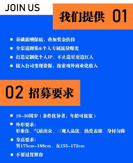 近日,某短剧平台对外发布《演员招募计划》,其中明确了多项招募要求:年龄需在18-30周岁(条件优异者可适当放宽);外形方面要求形象佳、气质出众、三观人品端正,且热爱表演、身材匀称;身高标准为男性175cm-188cm,女性155cm-172cm。