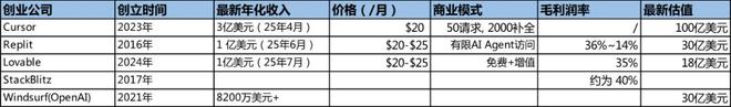 另一款体量更大的AI编程产品Cursor,同样取得了不逊于前文提到的两款明星产品的营收成绩。据彭博社报道,2025年6月Cursor背后的创业公司Anysphere年收入突破5亿美元,三个月前公开报道的年化收入还是2亿美元,这期间收入增长了3亿美元。最新的公开报道显示,Anysphere的估值已经达到200亿美元。