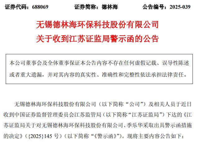 江苏证监局指出,公司上述行为违反了相关规定。季乐华作为时任财务负责人,未能勤勉尽责,对上述行为负有主要责任,违反了相关规定。根据规定,该局决定对德林海及季乐华采取出具警示函的行政监管措施,并记入证券期货市场诚信档案。