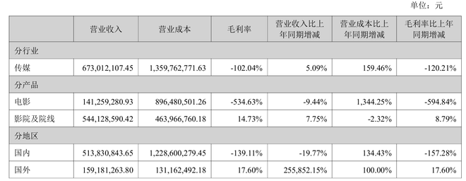 具体来看,公司影院及院线产品尽管营收和毛利率均较去年同期有所提升,但仍难以弥补电影产品毛利率的“断崖式”骤降至-534.63%的巨大缺口,其营收也同比略微减少9.44%。