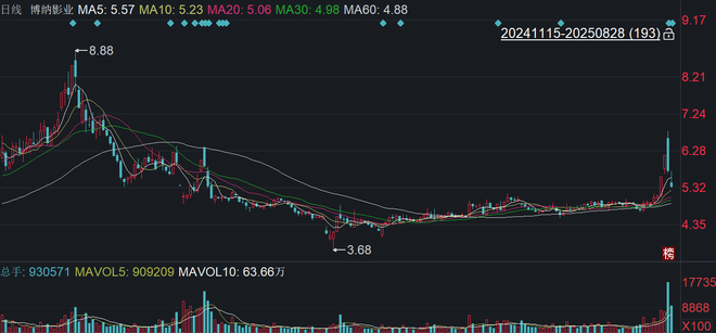 二级市场上,截至8月28日午间收盘,博纳影业大跌7.16%报5.32元/股,最新市值73.12亿元。曾在2022年8月创下15.23元/股高点的博纳影业,其股价较巅峰值已跌近六成。