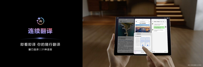 以智能助手「小艺」为代表,在三折叠大屏的多窗口模式下,效率被指数级放大。当你阅读外文文献时,「小艺」可以在另一侧窗口实时提供连续翻译;当你研究市场报告时,可以随时唤出「小艺知识库」进行深度问答或提炼摘要。AI 不再是一个孤立的应用,而是像一位资深顾问一样,静候在旁。