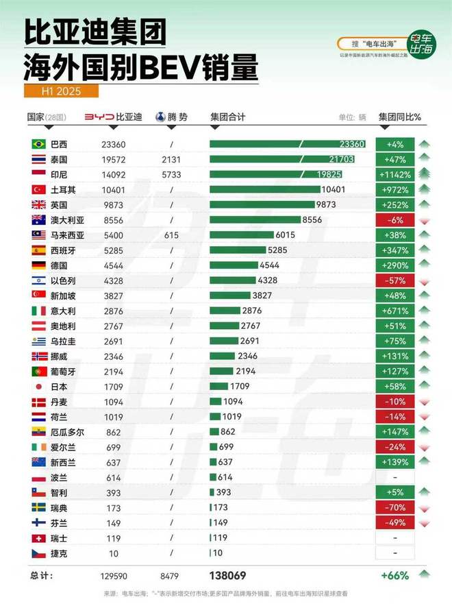 从“电车出海”统计的国别数据来看,主要是今年比亚迪同时实现了“上一批市场销量稳定+新一批市场销量暴涨”,其中暴涨最猛的印尼上半年累计销量已经去到近2万辆,同比增幅更是高达1142%。其他涨幅超过3位数的国家还有土耳其、英国、西班牙、德国、意大利、挪威、葡萄牙、厄瓜多尔、新西兰。甚至连日本这样的“全球汽车强国”,当地销量也实现了58%的增长。