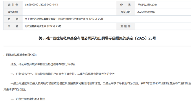 9月4日,根据广西证监局在2025年9月3日发布的公告,广西优航私募基金有限公司收到了出具警示函的监管措施。