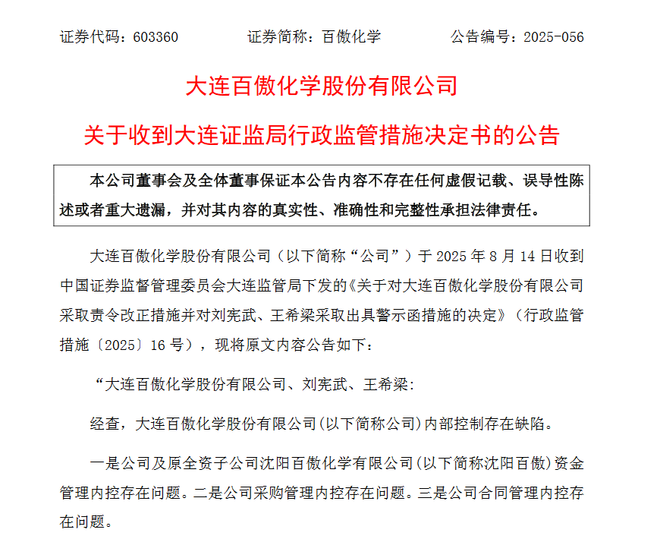 8月15日,百傲化学(603360)公告,公司于2025年8月14日收到中国证券监督管理委员会大连监管局下发的行政监管措施决定书。