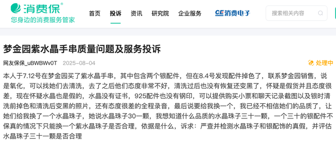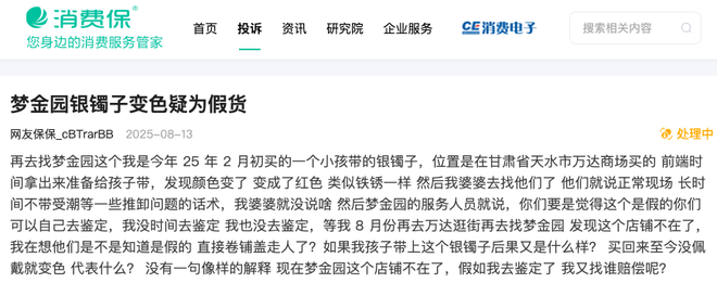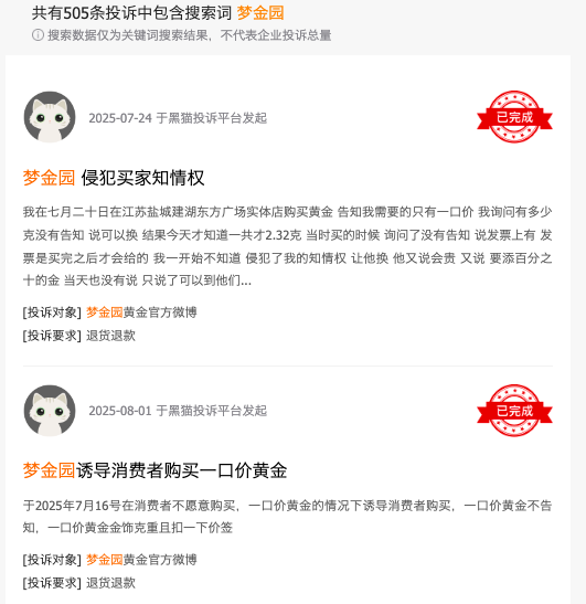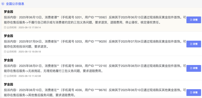 值得关注的是,2024年梦金园因“金包银事件”受到广泛关注。进入2025年,关于其黄金产品质量与服务方面的投诉频繁出现。