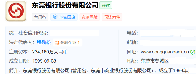 天眼查显示,东莞市商业银行成立于1999年9月8日,注册资本23.416亿元,法定代表人程劲松。2008年3月,东莞市商业银行更名为东莞银行。