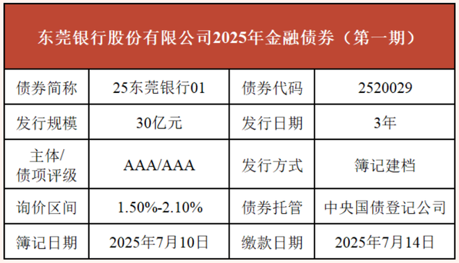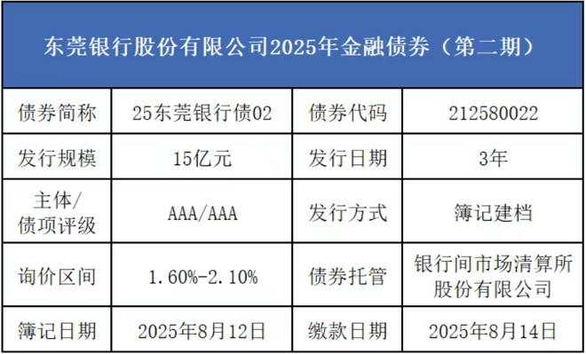 8月12日,东莞银行在全国银行间债券市场发行2025年金融债券(第二期),发行规模15亿元,期限3年,募资将用于"补充中长期稳定资金,提高核心负债规模,优化负债结构"等。