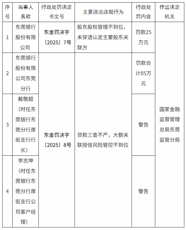 2025年4月17日,东莞金融监管分局连续开出两张罚单:东莞银行因"股东股权管理不到位、未穿透认定主要股东关联方"被罚25万元;同时,东莞银行东莞分行因"贷款三查不严,大额关联授信风险管控不到位"被罚85万元,两名高管被警告。